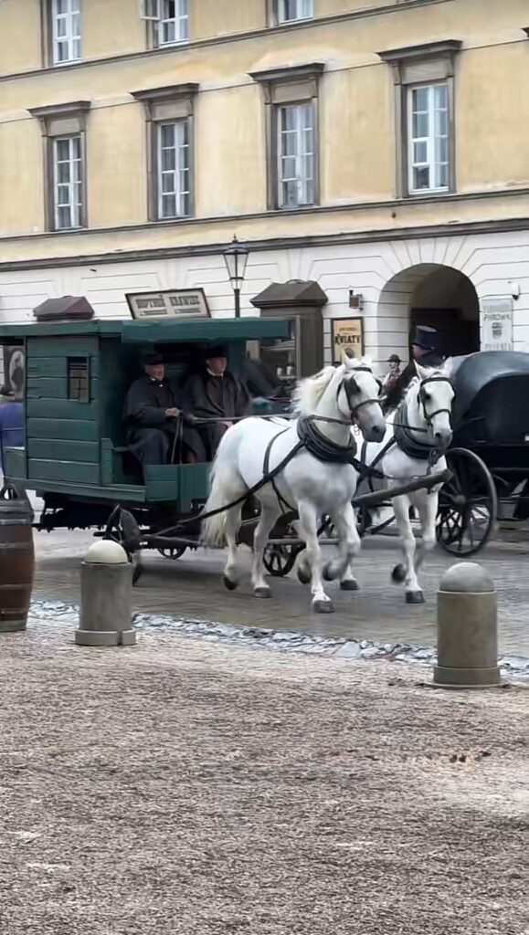 Krakowskie Przedmieście wyglądało zupełnie inaczej niż zwykle. Zamiast nowoczesnych witryn i samochodów można było zobaczyć aktorów w strojach z XIX wieku, stare powozy i szyldy stylizowane na dawne czasy. Przez chwilę można się było poczuć, jakby Warszawa naprawdę cofnęła się o ponad sto lat.